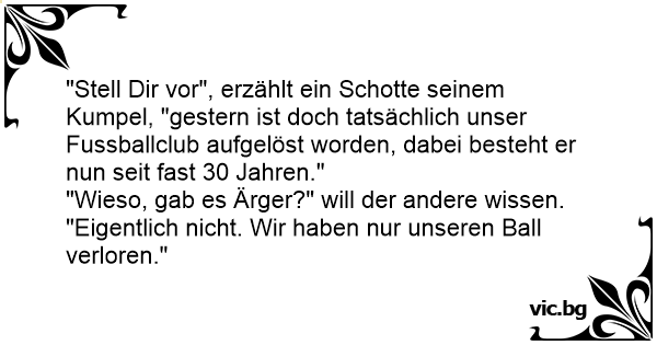 "Stell Dir vor", erzählt ein Schotte seinem Kumpel, "gestern ist doch tatsächlich unser Fussballclub aufgelöst worden, dabei besteht er nun seit fast 30 Jahren."