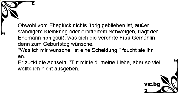 Obwohl es in der Ehe andauernd Streit gibt, fragt der Mann seine Frau, was sie sich von ihm zum Geburtstag wünscht? "Die Scheidung!", antwortet sie ohne zu zögern. Darauf der Gatte: "So viel wollte...
