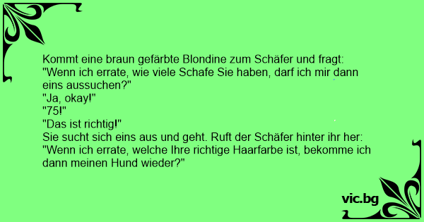 Eine Blondine, genervt von den ewigen Blondinenwitze, lässt sich die Haare rot färben und fährt aufs Land. Auf dem Weg dorthin trifft sie einen Hirten mit seiner Schafherde. Sie sagt ihm: "Wenn ich herausfinde wieviele Schafe Du hast darf ich eines mitnehmen, alles klar?" Der Hirte: "Ok"...