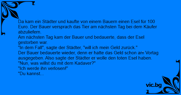 Der Bauer bedauerte wieder, denn er hatte das Geld schon am Vortag ausgegeben. Also sagte der Städter er wolle den toten Esel haben.