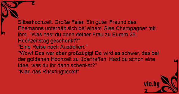 Silberhochzeit. Große Feier. Ein guter Freund des Ehemanns unterhält sich bei einem Glas Champagner mit ihm. "Was hast du denn deiner Frau zu Eurem 25. Hochzeitstag geschenkt?"