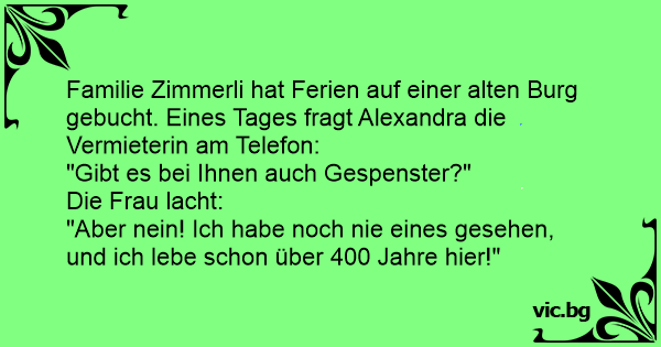 Ніч в старовинному англійському замку. Гість в розпачі бігає по темним коридорам та раптом зустрічає привида. — Я тут мешкаю вже 400 років, — каже привид. — О, як добре! — радіє гість. — Ви напевно...