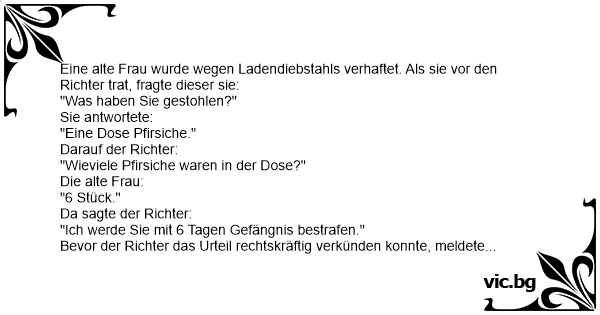 Eine 80-jährige Frau steht wegen Ladendiebstahl vor Gericht. Der Richter fragt sie, was Sie gestohlen hat. "Eine Dose Pfirsiche", lautet die schüchterne Antwort der Angeklagten. Auf die Frage des...