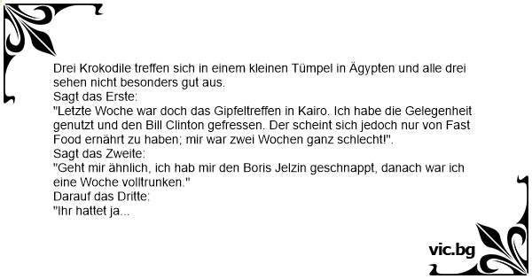 "Letzte Woche war doch das Gipfeltreffen in Kairo. Ich habe die Gelegenheit genutzt und den Bill Clinton gefressen. Der scheint sich jedoch nur von Fast Food ernährt zu haben; mir war zwei Wochen ganz schlecht!".