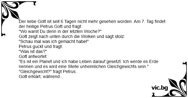 Der liebe Gott ist seit 6 Tagen niсhт mehr gesehen worden. Am 7. Tag findet der heilige Petrus Gott und fragt: