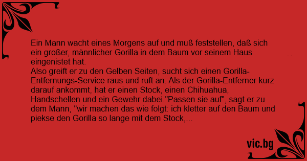 Also greift er zu den Gelben Seiten, sucht sich einen Gorilla-Entfernungs-Service raus und ruft an. Als der Gorilla-Entferner kurz darauf ankommt, hat er einen Stock, einen Chihuahua, Handschellen und ein Gewehr dabei."Passen sie auf", sagt er zu dem Mann, "wir machen das wie folgt: ich kletter auf den Baum und piekse den Gorilla so lange mit dem Stock, bis er runter fällt. Dann stürmt der Chihuahua auf den Gorilla los und beißt ihm in den Schritt. Der Gorilla wird daraufhin die Hände schützend in den Schoß legen, und genau in dem Moment legen sie ihm die Handschellen an."
