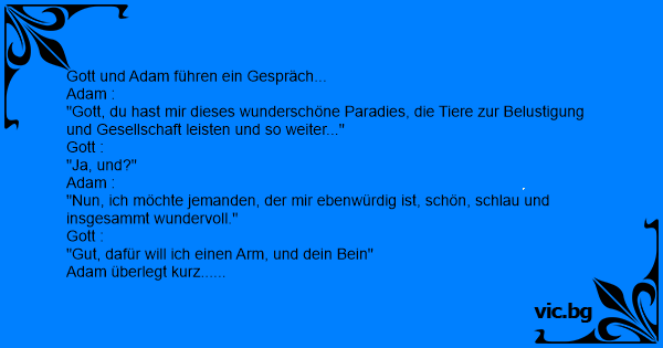 Adam lebt nun schon einige Zeit glücklich im Paradies, doch allmählich wird ihm doch etwas langweilig und er fragt den lieben Gott, ob er nicht für etwas Abwechslung sorgen könnte. Der liebe Gott...