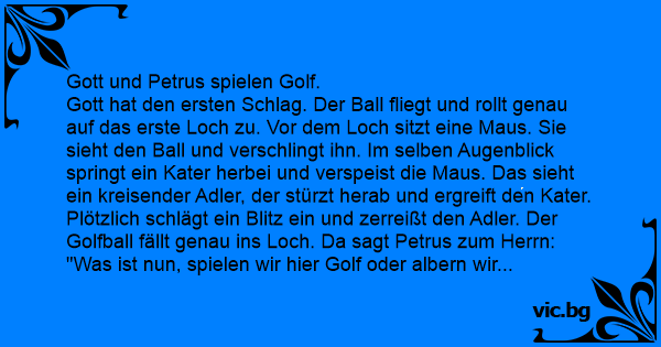 Gott hat den ersten Schlag. Der Ball fliegt und rollt genau auf das erste Loch zu. Vor dem Loch sitzt eine Maus. Sie sieht den Ball und verschlingt ihn. Im selben Augenblick springt ein Kater herbei und verspeist die Maus. Das sieht ein kreisender Adler, der stürzt herab und ergreift den Kater. Plötzlich schlägt ein Blitz ein und zerreißt den Adler. Der Golfball fällt genau ins Loch. Da sagt Petrus zum Herrn: