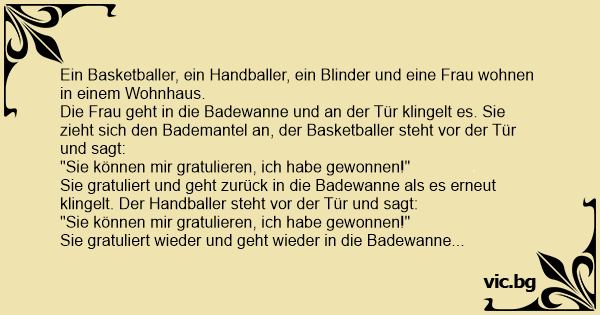Sie gratuliert und geht zurück in die Badewanne als es erneut klingelt. Der Handballer steht vor der Tür und sagt: