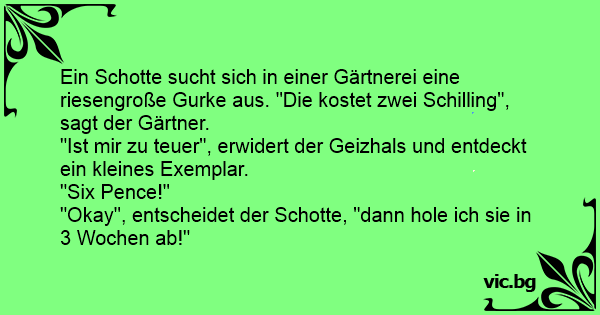 Ein Schotte sucht sich in einer Gärtnerei eine riesengroße Gurke aus. "Die kostet zwei Schilling", sagt der Gärtner.