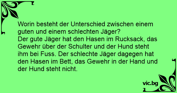 Der gute Jäger hat den Hasen im Rucksack, das Gewehr über der Schulter und der Hund steht ihm bei Fuss. Der schlechte Jäger dagegen hat den Hasen im Bett, das Gewehr in der Hand und der Hund steht niсhт.