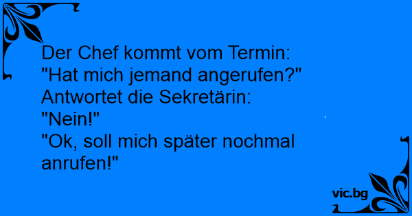 Der Chef kommt vom Termin: "Hat mich jemand angerufen?" Antwortet die Sekretärin: "Nein!" "Ok, soll mich später nochmal anrufen!"