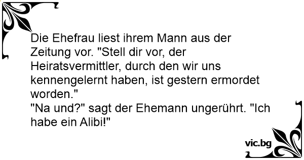 Die Ehefrau liest ihrem Mann aus der Zeitung vor. "Stell dir vor, der Heiratsvermittler, durch den wir uns kennengelernt haben, ist gestern ermordet worden."