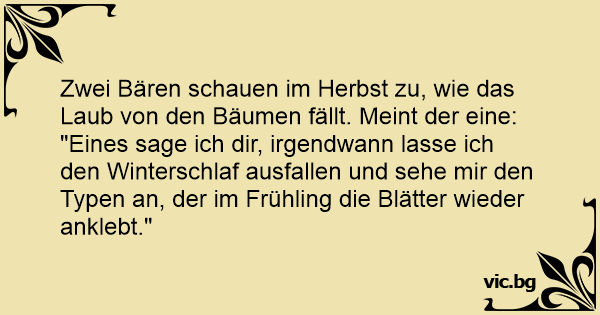 "Eines sage ich dir, irgendwann lasse ich den Winterschlaf ausfallen und sehe mir den Typen an, der im Frühling die Blätter wieder anklebt."