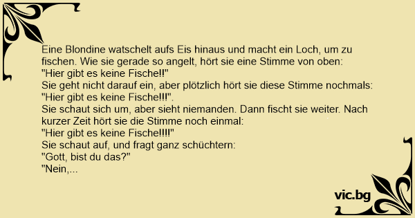Ein Angler geht aufs Eis, um zu Angeln. Mit einer Spitzhacke will er ein Loch in das Eis schlagen. Nach dem ersten Schlag hört er eine Stimme: „Hier gibt es keinen Fisch!“ Er schaut sich um und...