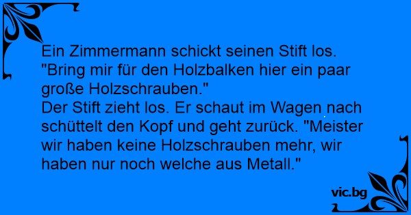 Der Stift zieht los. Er schaut im Wagen nach schüttelt den Kopf und geht zurück. "Meister wir haben keine Holzschrauben mehr, wir haben nur noch welche aus Metall."