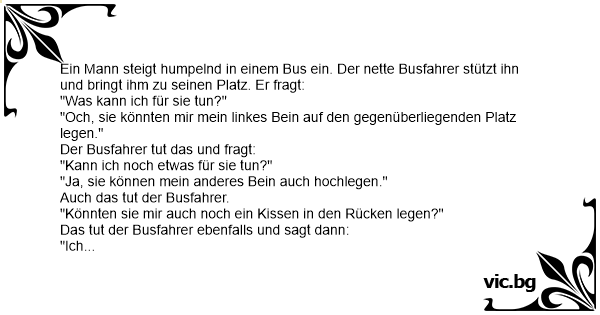 Ein Mann steigt humpelnd in einem Bus ein. Der nette Busfahrer stützt ihn und bringt ihm zu seinen Platz. Er fragt: