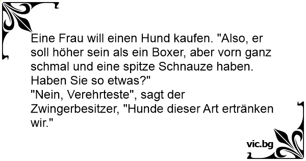 Eine Frau will einen Hund kaufen. "Also, er soll höher sein als ein Boxer, aber vorn ganz schmal und eine spitze Schnauze haben. Haben Sie so etwas?"