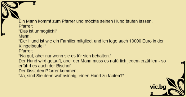 Kommt ein Priester zum Beichten: "Vater, ich habe gesündigt. Ich habe gestern einen Hund getauft." Der andere Priester ist entsetzt: "Waaas hast du? Einen Hund getauft? Ja, bist du denn des...