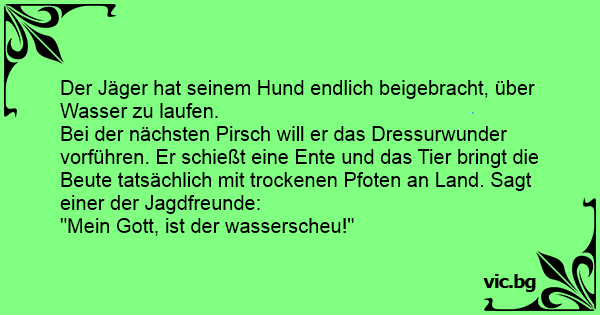 Bei der nächsten Pirsch will er das Dressurwunder vorführen. Er schießt eine Ente und das Tier bringt die Beute tatsächlich mit trockenen Pfoten an Land. Sagt einer der Jagdfreunde: