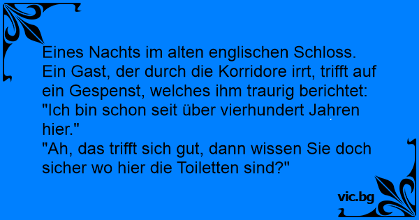 - Нощ в стар английски замък. Объркан гост минава през тъмен и мрачен коридор. Изведнъж се сблъсква с призрак, който решил да го сплаши и казал с дрезгав глас: