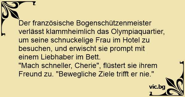 Der französische Bogenschützenmeister verlässt klammheimlich das Olympiaquartier, um seine schnuckelige Frau im Hotel zu besuchen, und erwischt sie prompt mit einem Liebhaber im Bett.