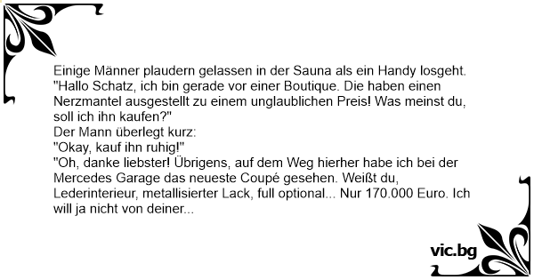 Pāris biezie sēž pirtī, zvana mobilais. Viens paceļ klausuli: - Hallo!? Jā, dārgā, pirtī... jā, ar draugiem... Ko nopirkt? Priekš kam Tev 11-tais kažoks? Cik? Ok, tu zini, kur nauda stāv... Pēc...