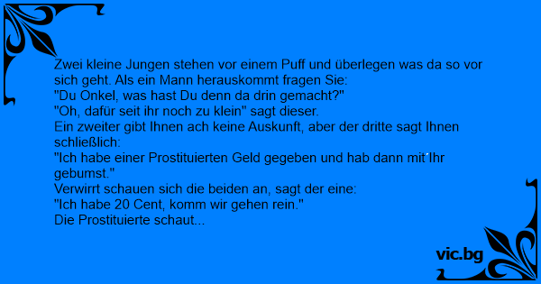 Die Prostituierte schaut niсhт schlecht als plötzlich zwei kleine Jungen vor Ihr stehen, Ihr die 20 Pfennig zeigen und sagen sie wollen вuмsеn. Da nimmt die Prostituierte die Köpfe der kleinen, knallt sie voll zusammen, sackt das Geld ein und verschwindet.