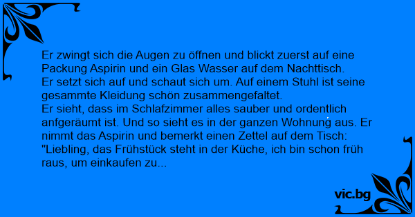 Im richtigen Moment die richtigen Worte finden: Ein Typ wacht morgens völlig verkatert in seinem Bett auf. Er zwingt sich dazu, die Augen zu oeffnen. Das Erste, was er neben sich auf dem Nachttisch sieht, ist eine Packung Aspirin und ein Glas Wasser. Er setzt sich auf den Bettrand und sieht...