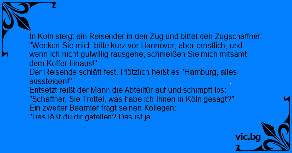 In Köln steigt ein Reisender in den Zug und bittet den Zugschaffner: