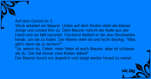 Stock arbeitet ein Maurer. Unten auf dem Boden steht ein kleiner Junge und schaut ihm zu. Dem Maurer rutscht die Kelle aus der Hand und sie fällt herunter. Fluchend klettert er die drei Stockwerke herab, um sie zu holen. Der Kleine steht da und lacht dreckig. "Was gibt's denn da zu lachen?"