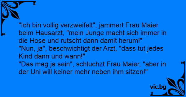 "Ich bin völlig verzweifelt", jammert Frau Maier beim Hausarzt, "mein Junge macht sich immer in die Hose und rutscht dann damit herum!"