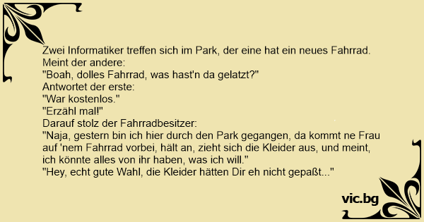 Zwei Informatiker treffen sich im Park, der eine hat ein neues Fahrrad.