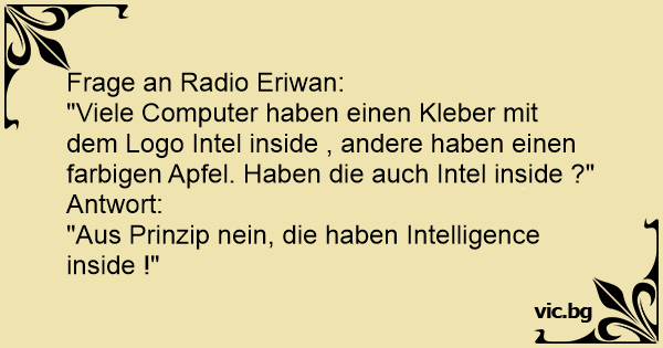 "Viele Computer haben einen Kleber mit dem Logo Intel inside , andere haben einen farbigen Apfel. Haben die auch Intel inside ?"