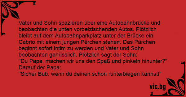 Vater und Sohn spazieren über eine Autobahnbrücke und beobachten die unten vorbeizischenden Autos. Plötzlich bleibt auf dem Autobahnparkplatz unter der Brücke ein Cabrio mit einem jungen Pärchen stehen. Das Pärchen beginnt sofort intim zu werden und Vater und Sohn beobachten genüsslich. Plötzlich sagt der Sohn: