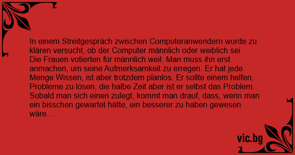 Die Männer stimmten aus folgenden Gründen für weiblich: Niсhт einmal der Schöpfer versteht ihre innere Logik. Die Sprache, mit der sie sich untereinander verständigen, ist für niemand sonst verständlich. Sogar die kleinsten Fehler werden im Langzeitgedächtnis zur späteren Verwendung abgespeichert. Sobald man einen hat, geht fast das ganze Geld für Zubehör drauf.