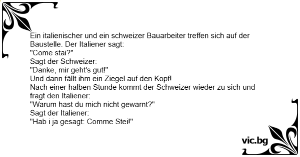 Ein italienischer und ein schweizer Bauarbeiter treffen sich auf der Baustelle. Der Italiener sagt:
