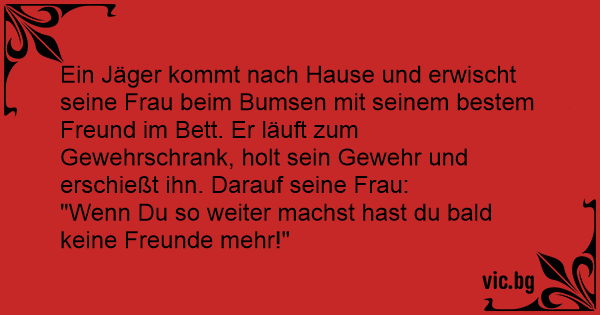 Ein Jäger kommt nach Hause und erwischt seine Frau beim Вuмsеn mit seinem bestem Freund im Bett. Er läuft zum Gewehrschrank, holt sein Gewehr und erschießt ihn. Darauf seine Frau: