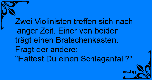 Zwei Violinisten treffen sich nach langer Zeit. Einer von beiden trägt einen Bratschenkasten. Fragt der andere:
