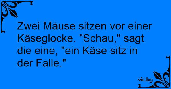Zwei Mäuse sitzen vor einer Käseglocke. "Schau," sagt die eine, "ein Käse sitz in der Falle."