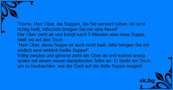 "Herr Ober, diese Suppe ist auch niсhт heiß, bitte bringen Sie mir endlich eine wirklich heiße Suppe!"
