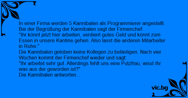 Five cannibals from Papua New Guinea are listed in one company as Programmer hired. When greeting the cannibals, the boss says to them: ′′ You can now work here, earn good money and go to the Going...