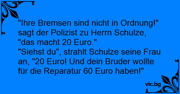 "Ihre Bremsen sind niсhт in Ordnung!" sagt der Polizist zu Herrn Schulze, "das macht 20 Euro."