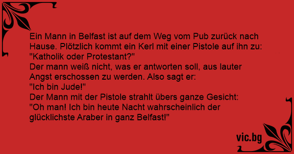 Ein Mann in Belfast ist auf dem Weg vom Pub zurück nach Hause. Plötzlich kommt ein Kerl mit einer Pistole auf ihn zu: