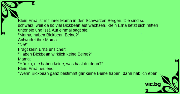 Klein Erna ist mit ihrer Mama in den Schwarzen Bergen. Die sind so schwarz, weil da so viel Bickbean auf wachsen. Klein Erna setzt sich mitten unter sie und isst. Auf einmal sagt sie: