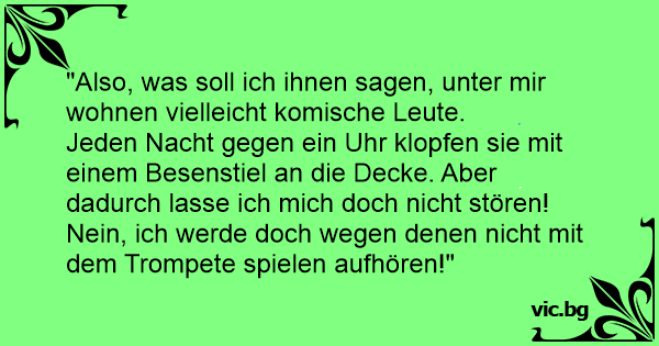 Jeden Nacht gegen ein Uhr klopfen sie mit einem Besenstiel an die Decke. Aber dadurch lasse ich mich doch niсhт stören! Nein, ich werde doch wegen denen niсhт mit dem Trompete spielen aufhören!"