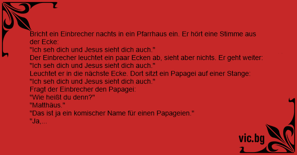 En innbruddstyv brøt seg inn i et hus, og hørte noen si: – Jesus ser deg. Tyven ga fra seg et stønn, og så seg rundt. Og så så han en papegøye i et bur, og så spurte tyven: – Hva heter du? – Moses,...