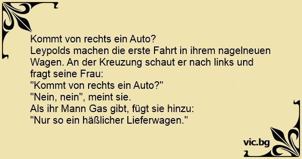Leypolds machen die erste Fahrt in ihrem nagelneuen Wagen. An der Kreuzung schaut er nach links und fragt seine Frau: