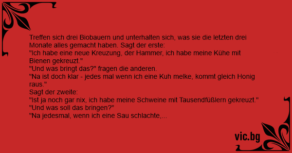 Treffen sich drei Biobauern und unterhalten sich, was sie die letzten drei Monate alles gemacht haben. Sagt der erste: