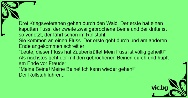 Drei Kriegsveteranen gehen durch den Wald. Der erste hat einen kaputten Fuss, der zweite zwei gebrochene Beine und der dritte ist so verletzt, der fährt schon im Rollstuhl.